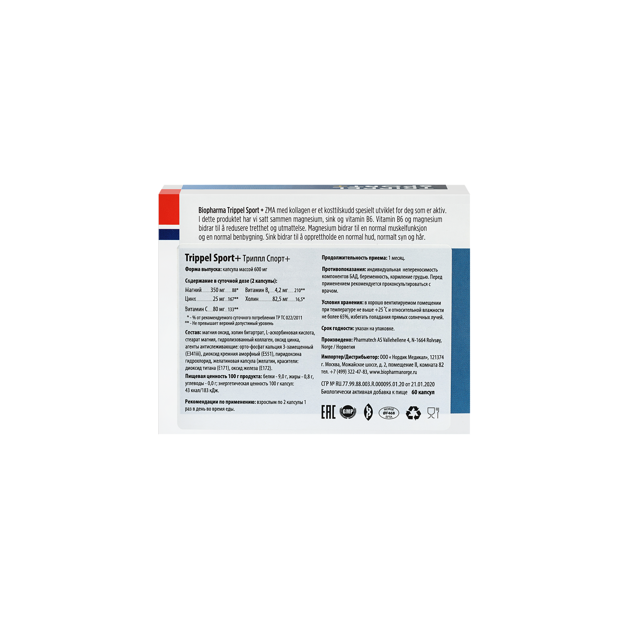 Натуральная пищевая добавка из Норвегии. Содержит морской коллаген для суставов и ZMA витамины, магний и цинк. В упаковке 60 капсул.